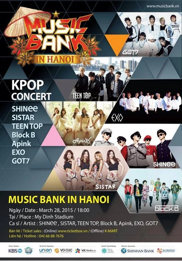 In 2015, VK Entertainment co-organized Music Bank in Hanoi,featuring some of the most popular Korean groups, including EXO, SHINEE, SISTAR, BLOCK B, GOT7, APINK, TEEN TOP